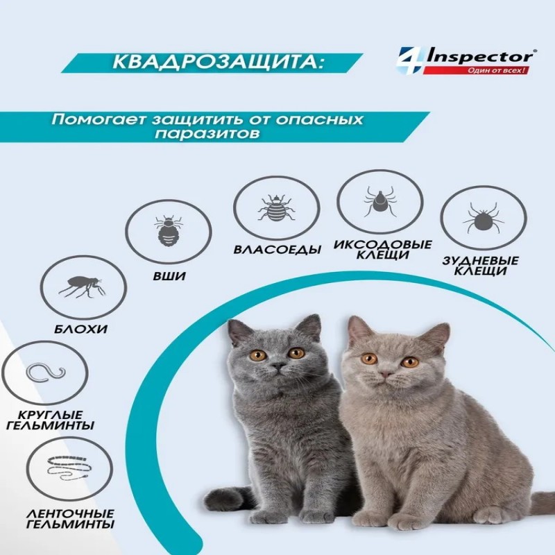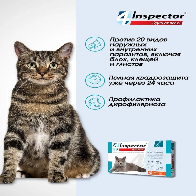 Inspector Quadro – один от всех! Комплексные капли против 20 видов наружных и внутренних паразитов.