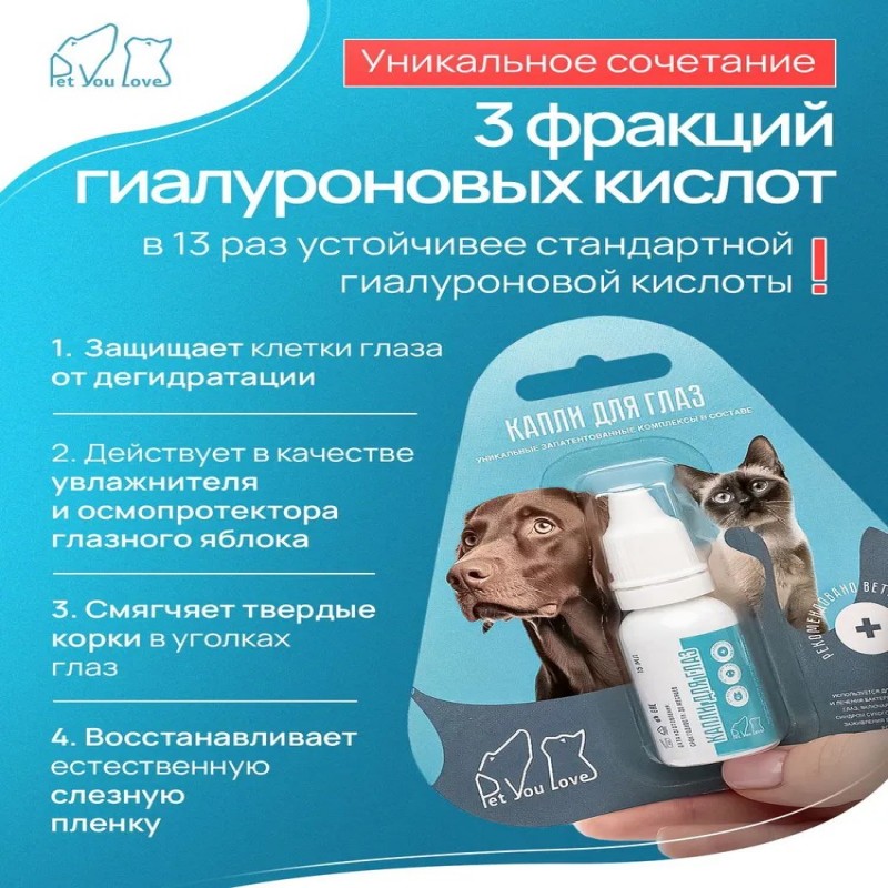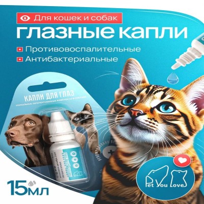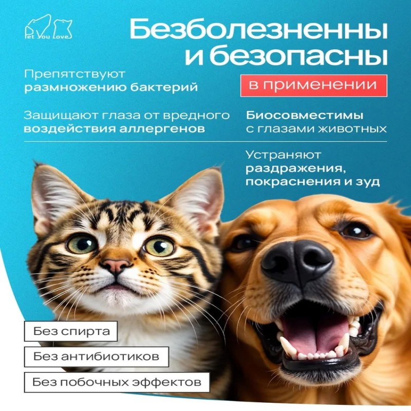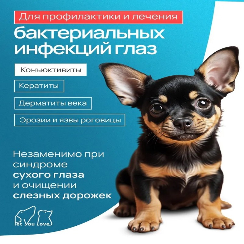 Глазные капли для животных Pet You Love – зоокосметическое средство, предназначенное для профилактики и лечения бактериальных инфекций глаз.