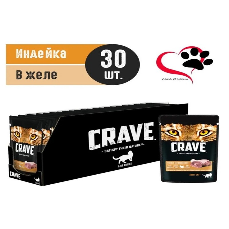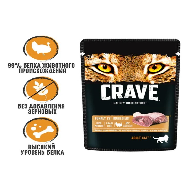 Влажный полнорационный корм CRAVE для взрослых кошек с индейкой, 70г Влажный корм CRAVE™ для взрослых кошек, содержащий минимум 99% ингредиентов животного происхождения, вдохновлен естественным рационом кошки. Ингредиент № 1 в нем — настоящее мясо. Это придает питомцу энергию, насыщает белком и поддерживает организм в тонусе. Состав Мясные кусочки (мясо и субпродукты (в том числе индейка 35%, говядина и курица), минеральные вещества, витамины, мякоть сахарной свеклы, таурин) и желе (вода, аминокислоты, загустители, сахара). Комплектация в упаковке 30 штук по 70 гр
