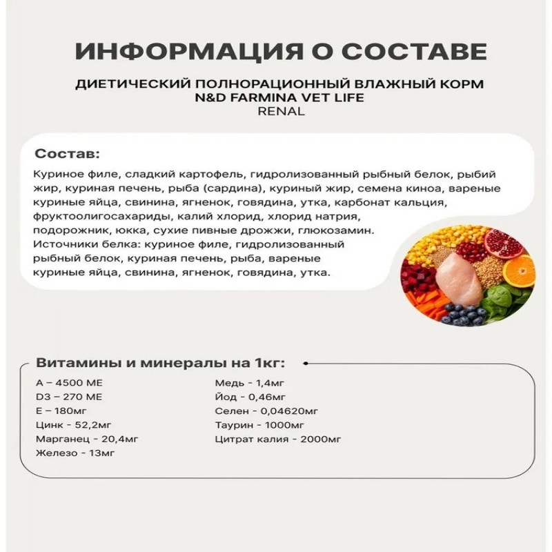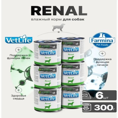 FARMINA VET LIFE CANIN RENAL – полнорационный диетический влажный корм для собак, специально разработанный для поддержания функции почек в случаях почечной недостаточности. ПЕРЕД ПРИМЕНЕНИЕМ ПРОКОНСУЛЬТИРУЙТЕСЬ С ВЕТЕРИНАРНЫМ ВРАЧОМ. Ключевые особенности: • Поддерживает оптимальный баланс азота, предоставляя при этом оптимальное количество высокоусваяемого белка. Для снижения азотемии ниже 60 мг, замедления прогрессирования заболевания, повешения поедаемости корма и продолжительности жизни. • Обеспечивает адекватное количество непротеиновых калорий. Ненасыщенные жиры (с высоким содержанием Омега-3 жирных кислот) – источник небелковой энергии, для снижения гиперлипидемии, для замедления прогрессирования заболевания, увеличения вкусовой привлекательности, предотвращение гломерулярной гипертензии, для снижения противовоспалительного эффекта, опосредованного Омега-6 жирными кислотами. • Высокая вкусовая привлекательность. Нормализует уровень фосфора в крови и предотвращает вторичный гиперпаратиреоз, стабилизирует СКФ, снижает минерализацию и повреждения оставшихся нефронов, замедляет прогрессирование болезни, снижает протеинурию. • Нормализует Ph-мочи, электролитный баланс и гидратацию. FARMINA VET LIFE CANIN RENAL – рекомендован при хронической болезни почек, а так же как вспомогательная терапия при застойной сердечной недостаточности. Показания: • Почечная недостаточность. • Печеночная энцефалопатия. • Сердечная недостаточность на ранних стадиях.