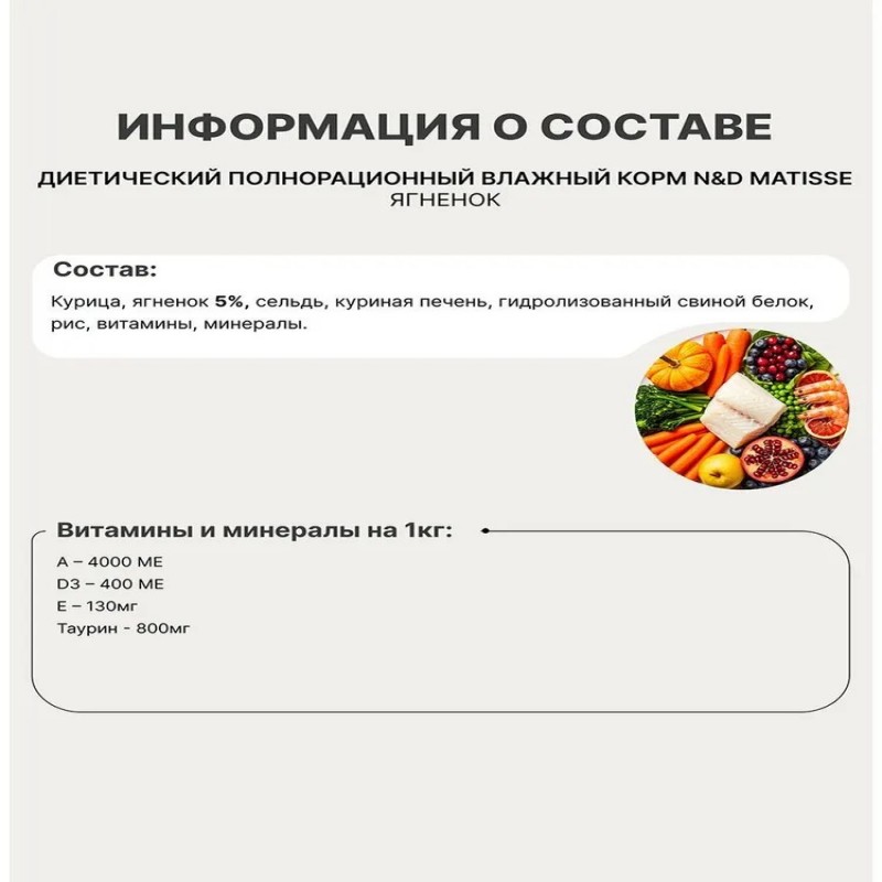Линия влажных кормов MATISSE - это корма премиум класса для кошек, которая имеет следующие характеристики: Используются только натуральные ингредиенты, гарантирующие высокую вкусовую привлекательность; Основные источники белка высокой биологической ценности - курица, ягненок, кролик и рыба (лосось, сардина и треска). Рыбий жир обеспечивает оптимальный баланс Омега-3/ Омега-6. Рис обеспечивает организм необходимым уровнем энергии. Оптимальное содержание таурина поддерживает качество зрения и обеспечивает здоровье сердца. Сбалансированное содержание витаминов и минеральных веществ поддерживает здоровье и улучшает качество жизни. Высокое содержание влаги снижает риск развития мочекаменной болезни.
