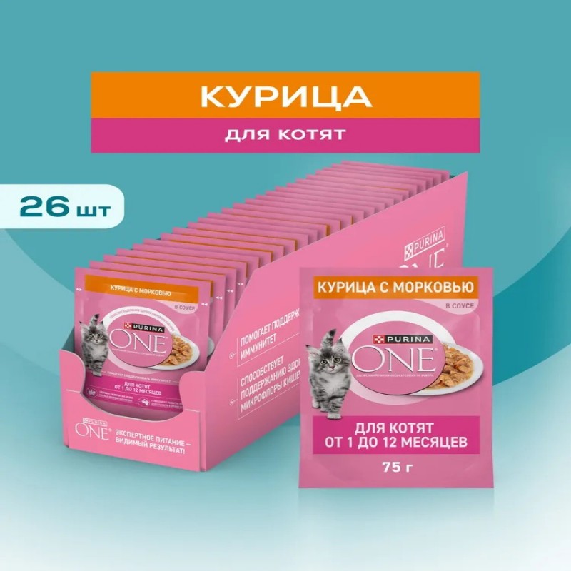 Влажный корм для котят Purina ONE, в соусе с курицей и морковью, 75 г
