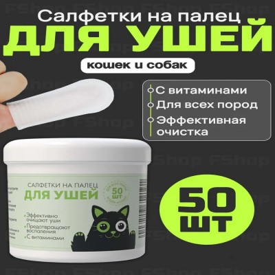 Влажные салфетки для чистки ушей кошек, собак, грызунов - 50 штук.