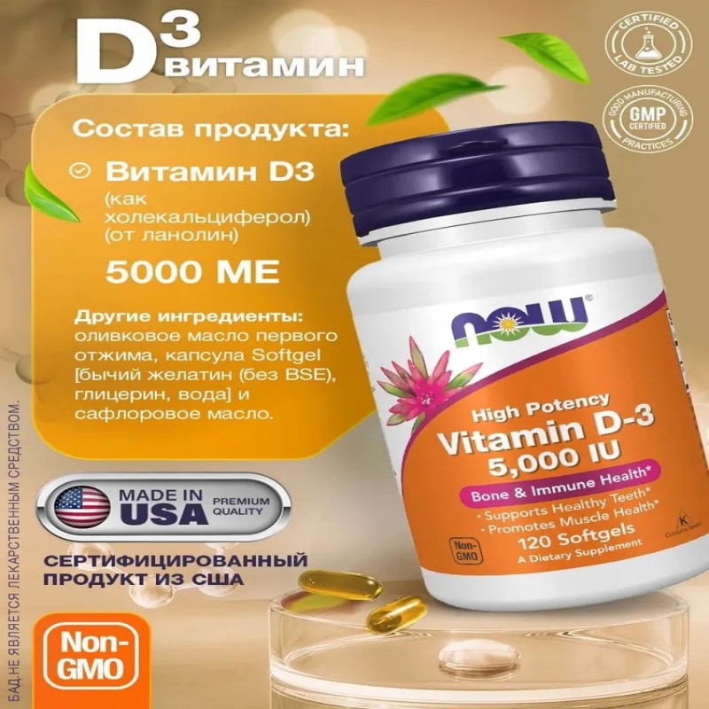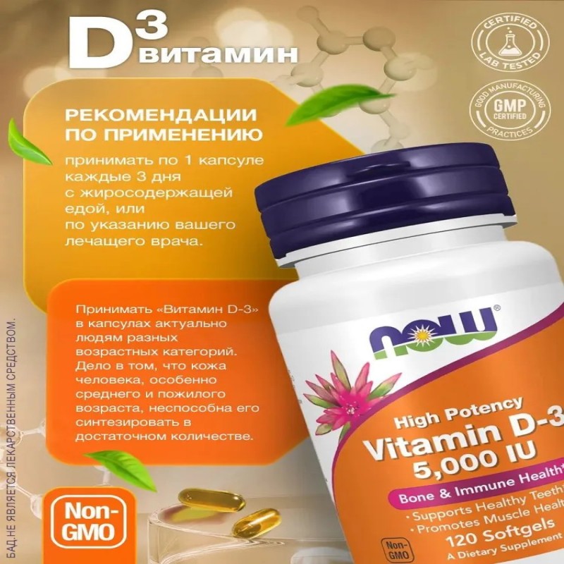 Витамин D3 от Now, это прекрасный выбор для тех, кто желает поддерживать свое здоровье и состояние на высоком уровне. Добавка производится на территории США, компанией Now foods с 55-летней историей в соответствии со стандартами GMP и FDA, не содержит ГМО. Витамин д3 один из наиболее важных витаминов для нашего здоровья. Он играет ключевую роль в поддержке иммунной системы и усвоении кальция, укреплении костей и зубов, улучшении настроения и памяти, а также в улучшении состояния волос, кожи и лица. Бад нау фудс д 3 также помогает против выпадения волос и в борьбе с депрессией, улучшает работу сердечно сосудистой системы и повышает иммунитет. Витамин д 5000ед отлично подходит для людей любого возраста и образа жизни. Он особенно полезен для тех, кто мало находится на солнце или живет в регионах с недостаточным уровнем солнечного света. Дозировка продукта в одной капсуле составляет 5000ме, что делает его идеальным источником этого важного витамина. Высокая концентрация быстро и эффективно усваивается организмом. Кроме того, желатиновые капсулы идут без глютена и не содержат ГМО, что делает их безопасными для людей с некоторыми видами аллергии. Vitamin D3 5000 ме рекомендуется для взрослых мужчин и женщин, девушек, спортсменов и подростков, а также для тех, кто хочет улучшить своё самочувствие. Однако, необходимо помнить, что дозировка должна быть определена врачом. Если вы хотите оставаться здоровым и энергичным на протяжении всего дня, мультивитамины Now Foods, это именно то, что вам нужно. Рекомендуем проконсультироваться с врачом перед началом приема любых мужских и женских витаминных комплексов, минералов или пищевых добавок к питанию. витамин д, витамин д3, витамин д 5 000, витамин д3 5000, витамин d, now d3, витамин d3, vitamin d3, д3 витамин, d3 5000, vitamin d3 5000, витамин d3 5000