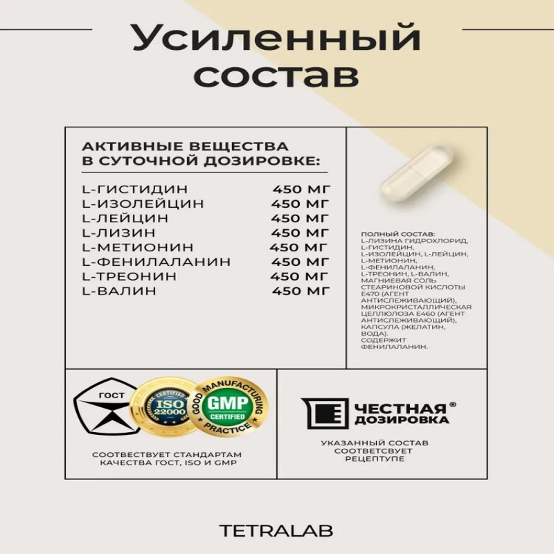Капсулы «Аминокислоты комплекс» ― биологически активная добавка к пище, содержащая восемь незаменимых аминокислот, необходимых для образования белков — главных строительных элементов организма, среди которых коллаген и эластин. В составе: L-гистидин, L-изолейцин, L-лейцин, L-лизин, L-метионин, L-фенилаланин, L-треонин, L-валин, каждой аминокислоты по 75 мг. Итого 600 мг в 1 капсуле.