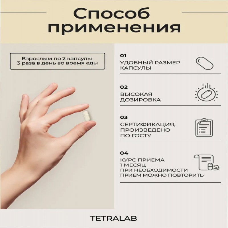 Способ применения и дозировка: взрослым по 2 капсулы 3 раза в день во время еды. Продолжительность приема: 1 месяц. При необходимости прием можно повторить. Перед применением необходимо проконсультироваться с врачом. Особые условия: биологически активная добавка к пище. Не является лекарством. Хранить в сухом месте при температуре от +10 до +25 градусов. Беречь от детей.