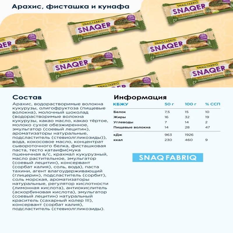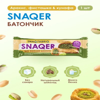 SNAQER by Dubai – новинка, вдохновленная всемирно известным Дубайским шоколадом. Это настоящая энергетическая бомба из хрустящего теста катаифи, фисташковой пасты и нежнейшего молочного шоколада без сахара. Такой здоровый перекус понравится как взрослым, так и детям! Полезная и не менее вкусная альтернатива обычным сладостям. Батончик подходит для тех, кто придерживается ПП и ЗОЖ. Идеальны к чаю, кофе и другим напиткам. Низкокалорийные десерты – это полезный перекус в любое время и в любом месте. Обязательно попробуйте SNAQER - это идеальный снек, наполняющий энергией и позитивом!Правильное питание – основа для здоровья и стройной фигуры. Многие полагают, что ПП – это одни лишь овощи, подсчёт КБЖУ для похудения, пресная еда и полный отказ от вкусняшек. Но Снэк Фабрик может изменить представление о ПП и показать, что оно можно быть не только полезным, но и вкусным! Полезные сладости незаменимы для тех, кто следит за своей фигурой, рационом и здоровьем. SNAQER - именно такой продукт! Минимум углеводов, много клетчатки и орехов, перемешанных в толстом слое ароматной карамели, покрытые настоящим молочным шоколадом. Полезные белковые батончики и без добавленного сахара! SNAQ FABRIQ – это не просто еда для похудения или диетические продукты, это привычные, но правильные сладости, которые прекрасно впишутся в любое спортивное и правильное питание, помогут заменить конфеты и шоколадки.