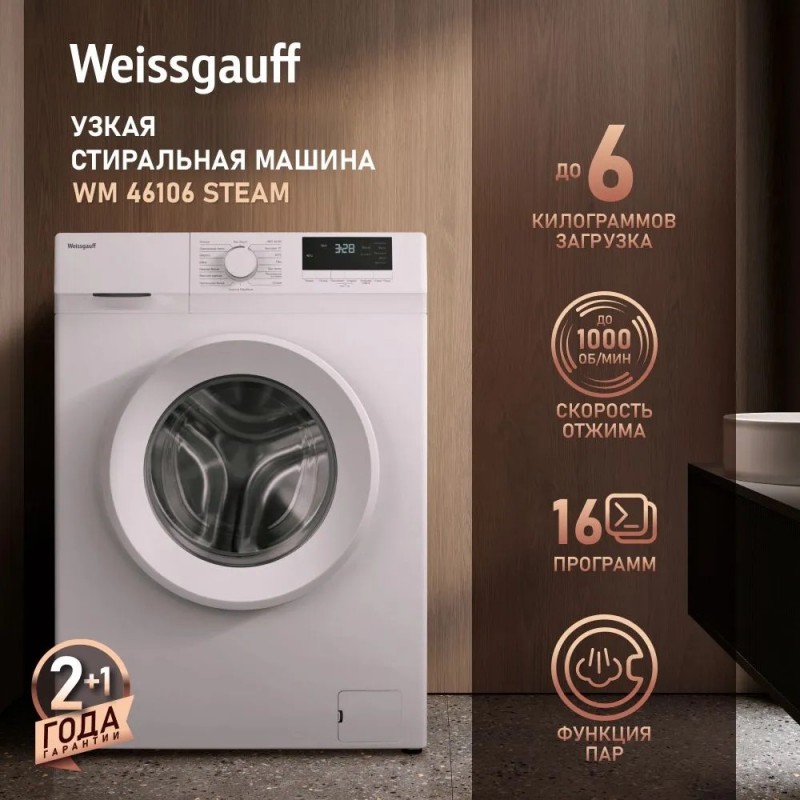 Отдельностоящая стиральная машина автомат Weissgauff оснащена функцией пара и автопрограммой Smart. Также данная узкая стиралка имеет показатель загрузки до 6 кг белья и скорость отжима до 1000 оборотов в минуту - это настоящее качество по разумной цене!