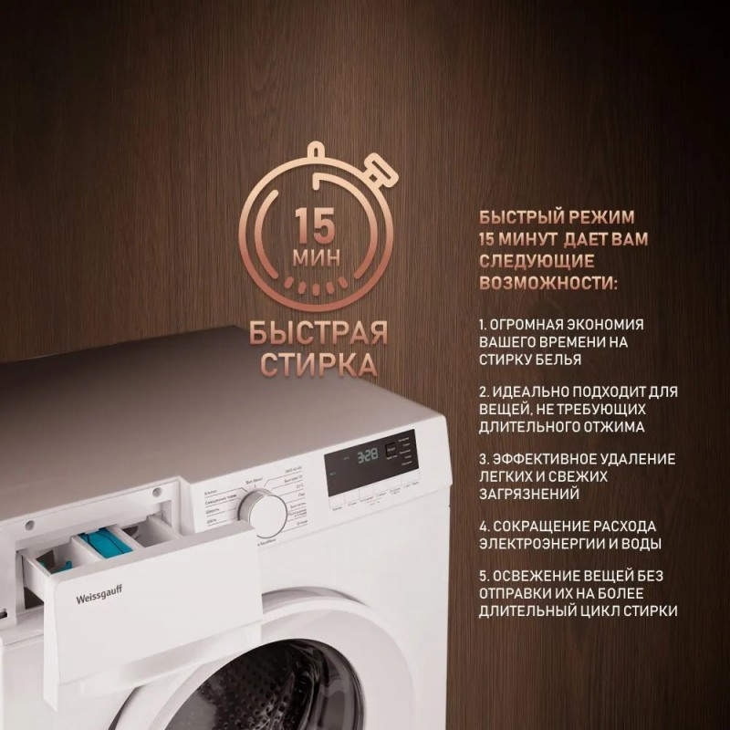 Режим Быстрая стирка 15 минут - это по-настоящему фантастическая программа для тех, кто умеет ценить своё время, а также этот режим идеально подходит для дачи, где одежда часто пачкается из-за работы на свежем воздухе!