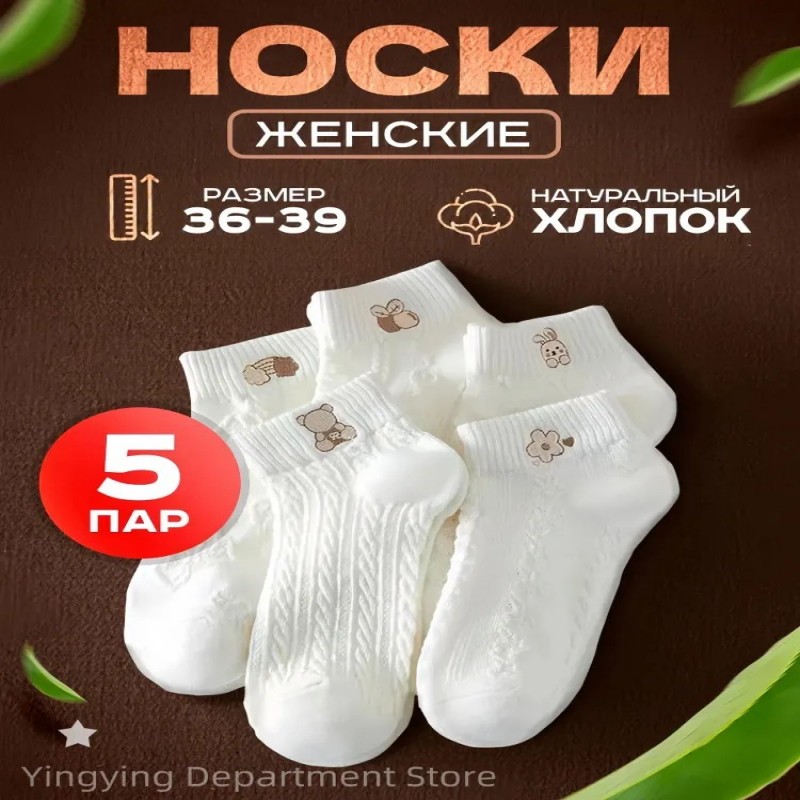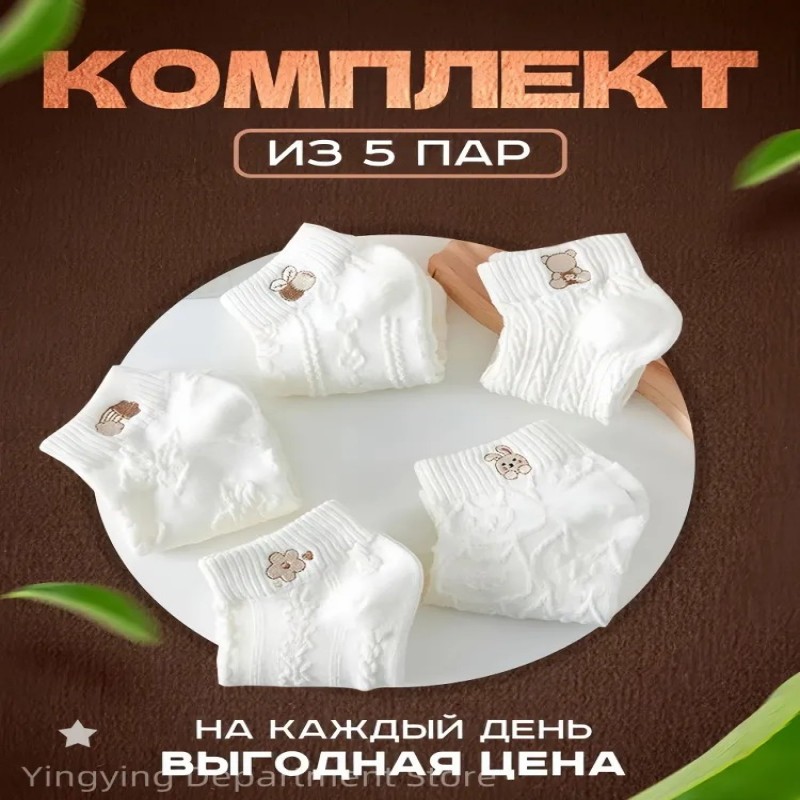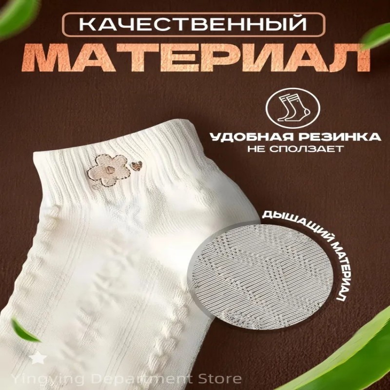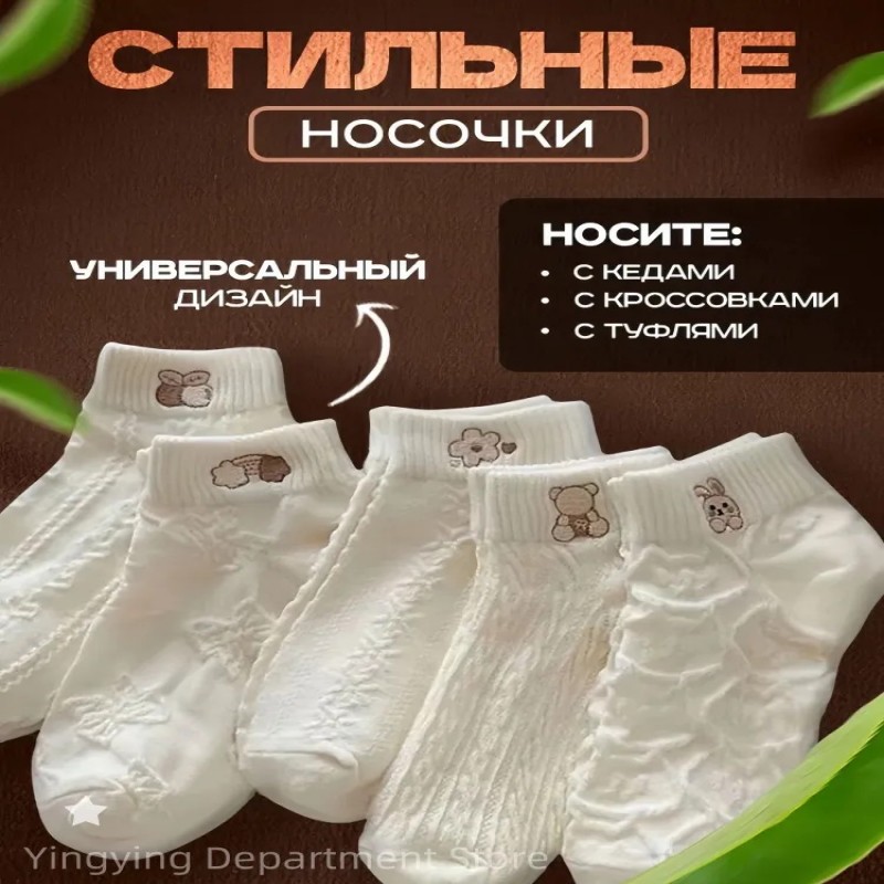 Носки ажурные женские являются не только практичным приобретением для ежедневного использования, но и отличным способом выразить свою любовь и внимание к близкому человеку. Набор белых, коротких, нежных носков включает 5 пар. Это белые носки из 80% хлопка, с прочной и мягкой резинкой, которая предотвращает сползание носков и не передавливает кожу. Внимание к деталям на максимальном уровне, также комплект носков женских дополняет принт на резинке носков в виде облака, цветочка, яблока, зайчика и медвежонка, которые точно не оставят никого равнодушным. Носки идеально сочетаются с любой одеждой и обувью, их можно носить на прогулку, в школу, университет или в гости, стильно смотрятся как с кроссовками, кедами, так и с босоножками, туфлями и туфлями. Надевая эти носки короткие женские, Вы будете чувствовать себя комфортно и уютно на протяжении всего дня. Модель белых носков женских выполнена в классическом стиле с ажурным плетением, что добавляет им изюминку. Их удобный шов не впивается в кожу и не причиняет дискомфорта. Этот набор носков также подойдет для занятий йогой, бегом, фитнесом, тренажерного зала или пикника с друзьями. Это отличный подарок на день рождения, Новый год для самой себя или близкого человека, который оценит вашу заботу и внимание. Комплект носков женских упакован в милую упаковку.