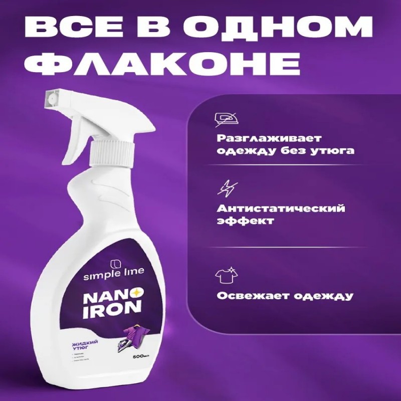Жидкий утюг для одежды спрей, антистатик для одежды и освежитель для дома в 1 флаконе 500 мл - это эффективный удод за одеждой и отличное решение, когда нет возможности быстро погладить и освежить вещи! Наш парфюмированный спрей для глажки с антистатиком выручит вас в любой ситуации, когда нужно разгладить складки и заломы на одежде, а времени и возможности для полноценной глажки нет. Жидкий утюг Nano Iron с освежающим эффектом подходит для различных видов одежды и ткани и поможет сэкономить ваше время для более приятных и полезных дел. РАБОТАЕТ КАК МАГИЯ, но НА НАТУРАЛЬНЫХ ТКАНЯХ (хлопок, лен, шерсть, шелк и тд.), на синтетике и водоотталкивающих тканях, к сожалению, чуда вы не увидите! На смешанных тканях зависит от процента синтетики. Большой объём разглаживающего спрея для одежды - экономичен и удобен для ухода за рубашками, блузками, школьной формой и футболками подростков, шторами, скатертями и гардинами; трудно поддающимися стирке – пледами, мебельными обивками, коврами, постельным бельем, школьными рюкзаками и спортивными сумками. Он обеспечивает легкий и быстрый эффект – всего-то нужно распылить средство на ткань, разладить ее руками и немного подождать, чтобы при высыхании средство зафиксировало волокна в распрямленном виде. Освежающий спрей для одежды также обеспечивает нейтрализацию запахов пота, что делает этот продукт незаменимым помощником в борьбе с нежелательными запахами. Нейтрализатор запахов работает эффективно на любых типах тканей, оставляя аромат чистого белья. Помяли одежду в поездке, на работе, на учебе, на празднике, достали мятую из шкафа, чемодана, рюкзака – спрей утюг поможет разгладить складки. Пропахли едой на кухне, в ресторане - поможет удалить запахи. Рефрешер для одежды помогает поддерживать одежду в отличном состоянии между стирками. Спрей утюг с эффектом антистатика и освежителя для ткани обеспечивает легкий, быстрый и бережный уход за одеждой без дополнительной стирки и глажки. Разглаживающий спрей для одежды обладает приятным ароматом и экологичным составом.