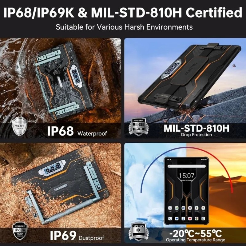 Планшетный компьютер OUKITEL RT8 оснащен корпусом из материала EVA, который соответствует военному стандарту MIL-STD-810H. IP68+IP69K не только работает под водой, но и противостоит проникновению пыли, грязи и других частиц. Он обладает повышенной прочностью и надежностью.