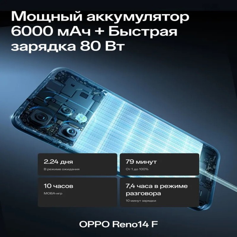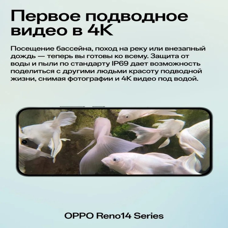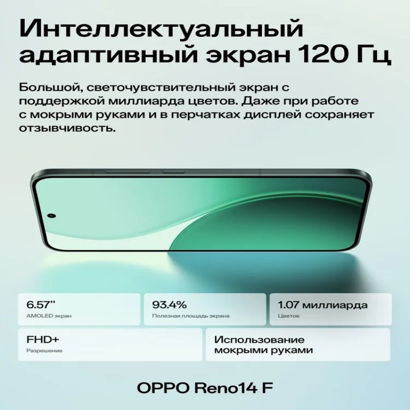 Откройте для себя OPPO Reno14 с ночной съемкой в высоком качестве, классом защиты от воды и пыли IP69, аккумулятором емкостью 6000 мА·ч и ИИ функциями. Сияющий зеленый Блистайте на любой вечеринке — мерцающие блики вокруг блока камер выгодно подчеркнут ваш образ. Новый уровень съемки при слабом освещении Мало света? Не проблема. Благодаря мощному сенсору, выдающейся вспышке и (3,5х) 50 Мп камере с телеобъективом. Даже в темноте ваши снимки будут четкими и детализированными. Сделайте любое фото с вечеринки светлее и ярче Благодаря выдающемуся качеству вспышки камера сможет запечатлеть ваши самые прекрасные моменты — будь то ужин при свечах или вечеринка. Включите ее и мгновенно осветите пространство вокруг. Защита от воды и пыли по стандарту IP69 Дает возможность разделить с другими людьми красоту подводной жизни, снимая фотографии и 4K видео под водой. Мощный аккумулятор 6000 мА·ч Играйте без подключения к розетке. Играйте дольше, ждите меньше. Мощный аккумулятор емкостью 6000 мА·ч обеспечит вас энергией на весь день — а после мгновенной зарядки, вы сможете вернуться в бой. 4K HDR видео с ИИ-обработкой Запечатлейте вечеринку в сверхчетком разрешении 4K HDR. Этот режим видеосъемки передает все оттенки и переходы, обеспечивая потрясающую детализацию и реалистичные цвета. ИИ Студия Освежите вид любого снимка. Проявите креативность с приложением ИИ Студия. Выберите стиль любого изображения или измените атмосферу с помощью классных эффектов —все в одном предустановленном приложении.