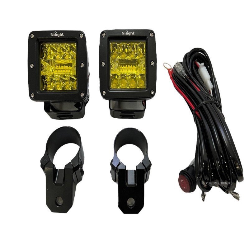 -2-CNC machined billet A Pillar clamp mounts For 1-7/8" Tubing with mounting hardware. -2 AMBER Lights 3" LED Lights. 42W -Combo Beam Type: Combining top and bottom 30°spot light and middle 170° flood light -1-12' wire harness with connectors and relay 1-1 Switch -Direct bolt on kit.