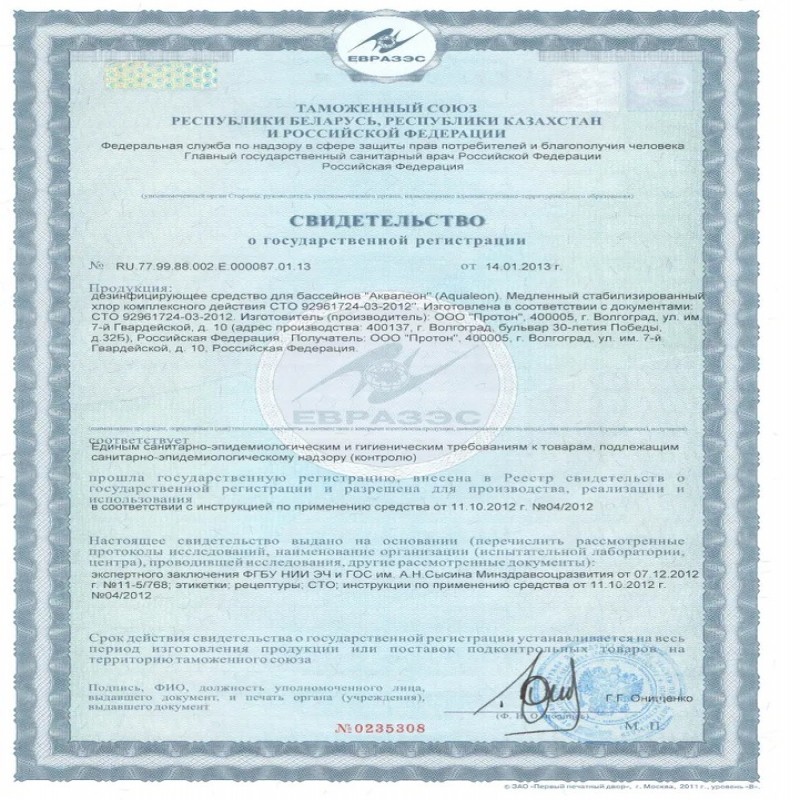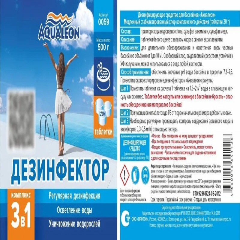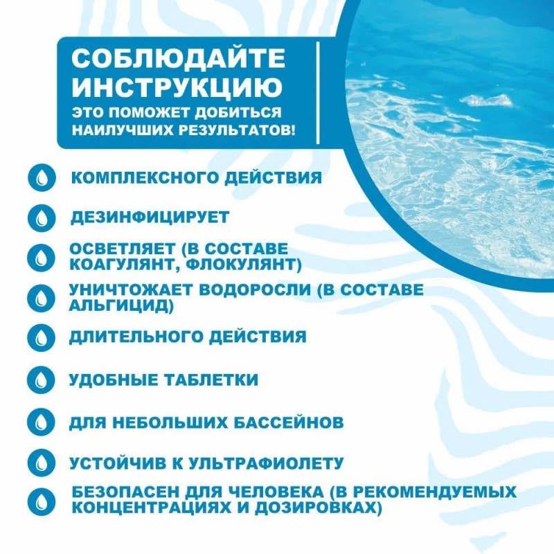 Перед применением дезинфицирующего средства необходимо обеспечить значение рН воды бассейна в пределах 7,2-7,6. Необходимое количество таблеток помещают в плавающую капсулу или в скиммер из расчета 1 таблетка на 1,5-2м3 воды. При интенсивном использовании бассейна дозировку допускается увеличивать в соответствии с показаниями тестера хлора. При этом необходимо постоянно производить контроль и корректировку содержания активного хлора в воде с помощью тестера и осуществлять контроль за содержанием циануровой кислоты в воде бассейна.