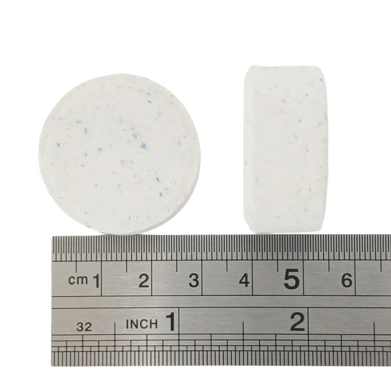 Таблетки белого цвета с синими вкраплениями с запахом хлора.