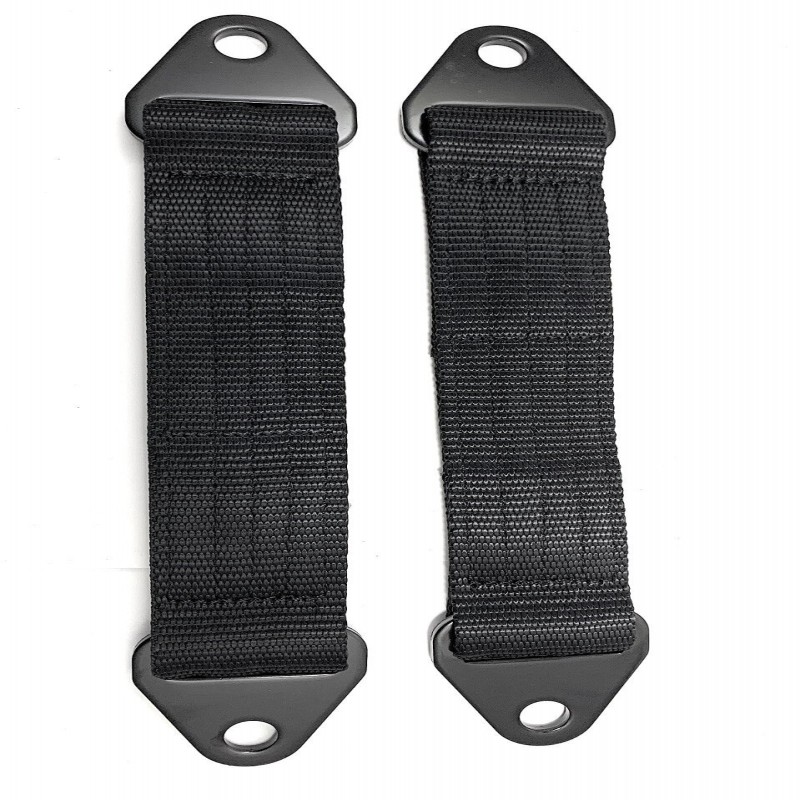 No returns on straps that have been mounted. -Size / length is measured hole center to hole -Sold in pairs= 2 straps per purchase -Chromoly Tabs with black powder coat. -1/2" Holes. -Straps are 2" wide / 1/4" Thick -5 Pass extreme stitch for added rigidity. -Load Deflectors between strap and tab to help distribute tension and prolong strap wear. -Does not include hardware