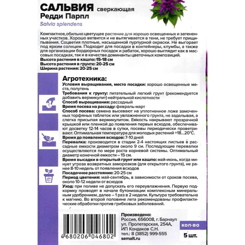 Сальвия «Редди Парпл» предпочитает легкую и питательную почву с добавлением вермикулита. Она отлично растет на солнечных участках и в легкой полутени. Растение выращивается рассадным способом, посев семян проводят с февраля до конца марта. На этапе 2-4 настоящих листьев сеянцы пикируют, в мае или начале июня пересаживают в кашпо или цветник.