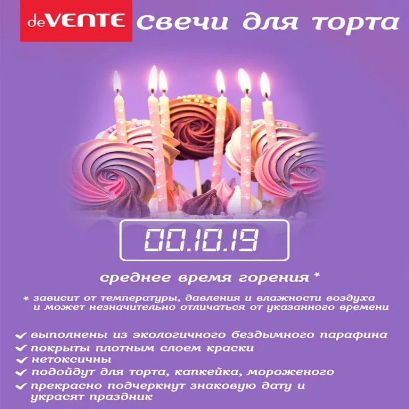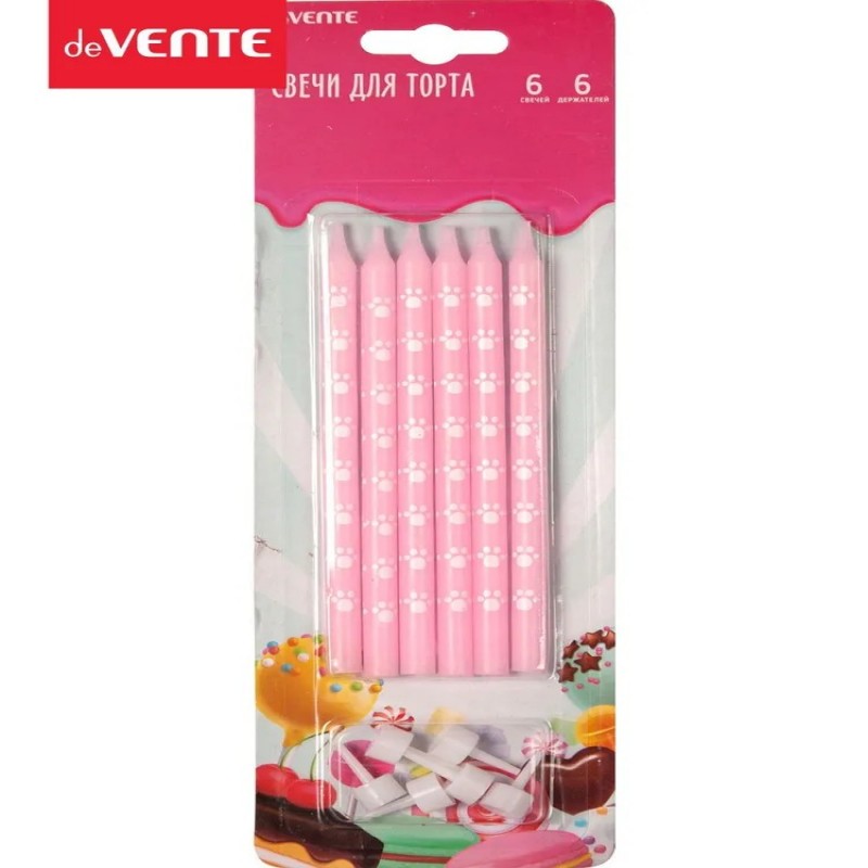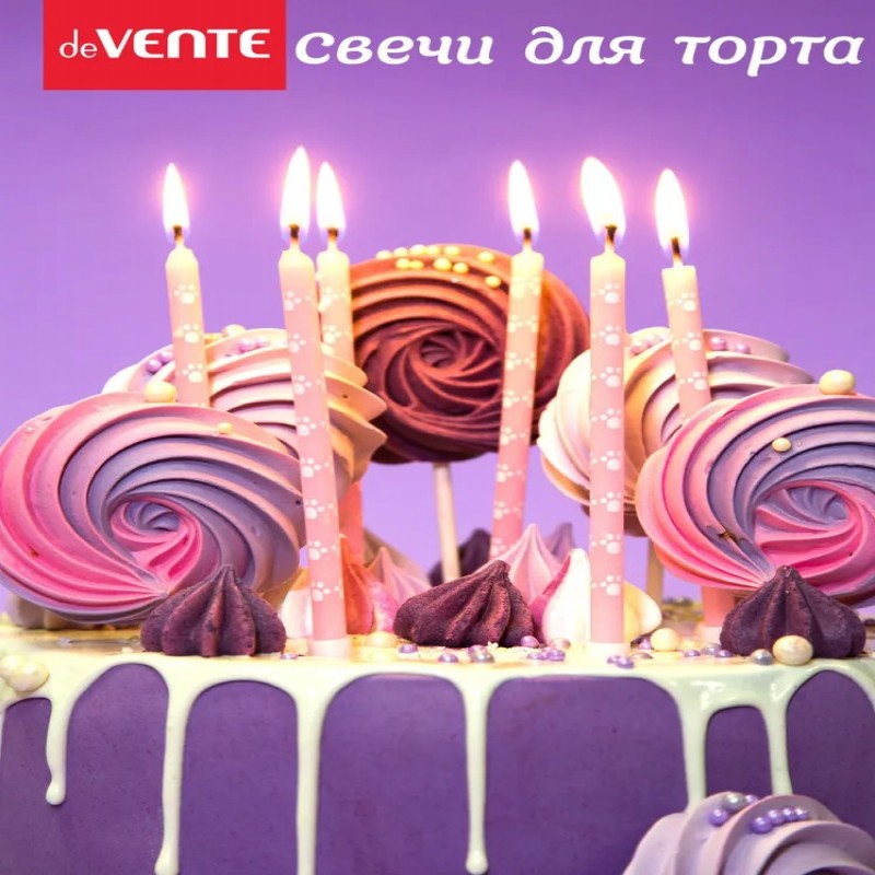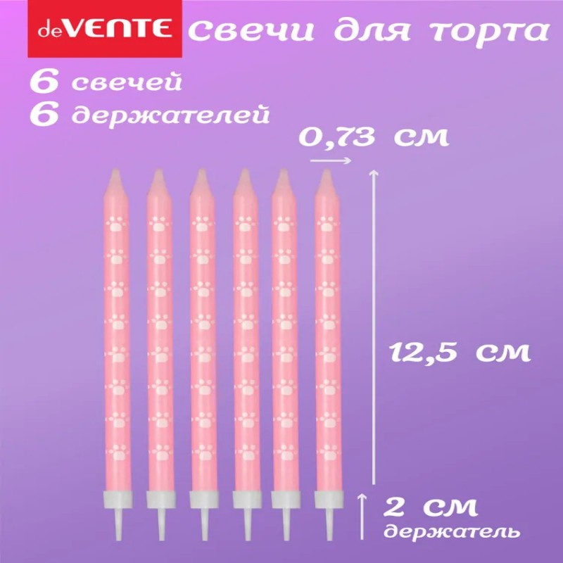 Комплектация Свеча - 8 шт. Свечи для торта deVENTE, коллекция Котик выполнены из экологичного и нетоксичного бездымного парафина, неприятного запаха гари не будет. В комплекте 6 свечей и 6 держателей. Высота каждой 12,5 см, диаметр 0,73 см. Высота держателя 2 см. Свеча покрыта качественной краской, которая не вздувается и не отлетает от перепада температуры. Благодаря тому, что у свечи длинный фитиль на всю длину свечки, у вас будет достаточно времени тожественно вынести торт, провести фотосессию с именинником и загадать несколько заветных желаний!