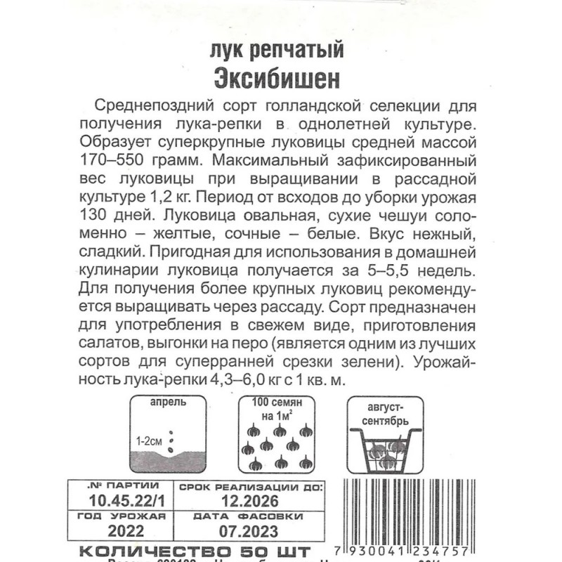 Лук Эксибишен Купить Лук Эксибишен Характеристики Вес с упаковкой примерно: 0.01 кг Цвет плодов: Вес плодов: 170-550 г. Срок созревания: август, сентябрь Время созревания: 130 дней Посадка: солнечное место, апрель Жизненный цикл: однолетнее Бренд: Сибирский сад В упаковке: 50 семян Комплектация 50 семян