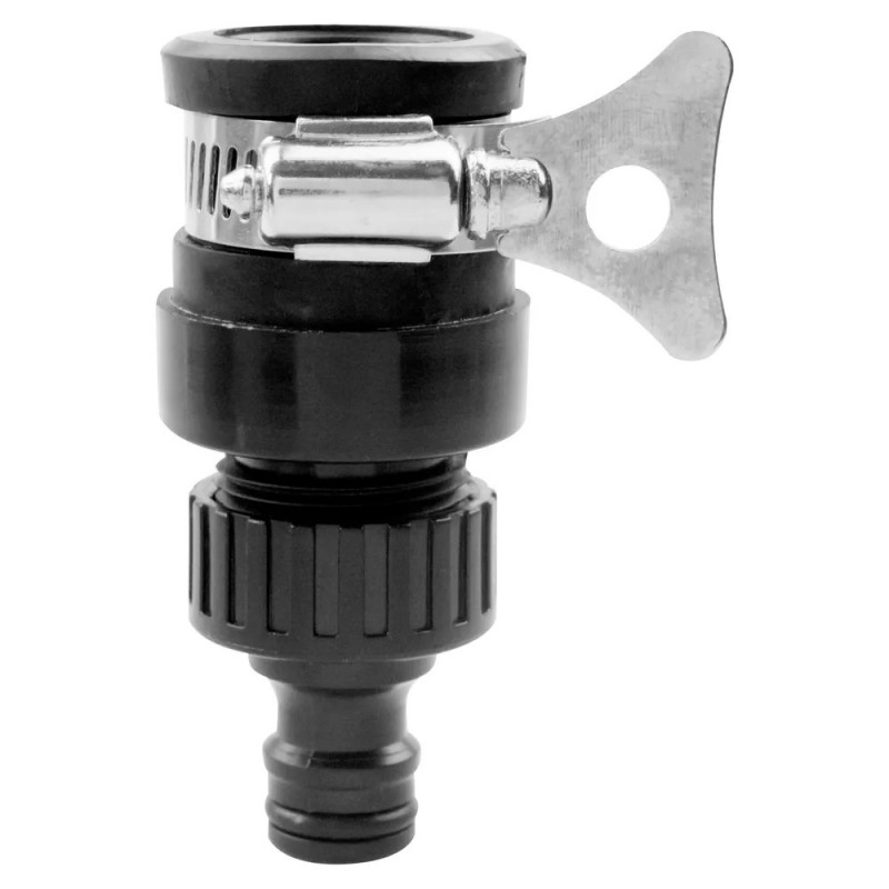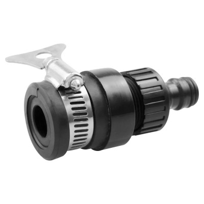 Коннектор используется на безрезьбовых кранах и позволяет подсоединять поливочный шланг к центральной системе подачи воды. Данное приспособление позволяет легко создать герметичное муфтовое соединение. Соединитель изготовлен из прочного пластика, место крепления к крану затягивается металлическим хомутом, кроме того, такое соединение отличается универсальностью и удобной эксплуатацией. Комплектация Хомут