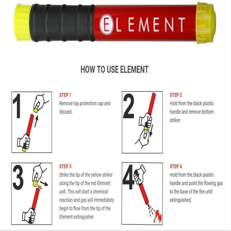 Element's most popular model. Offering 100 seconds of fire fighting protection, E100 is recommended for professional use (automotive, racecar, side x side, power sports, garage, marine, etc). E100's extremely small and lightweight construction allow for storage almost anywhere. Internationally tested and certified.